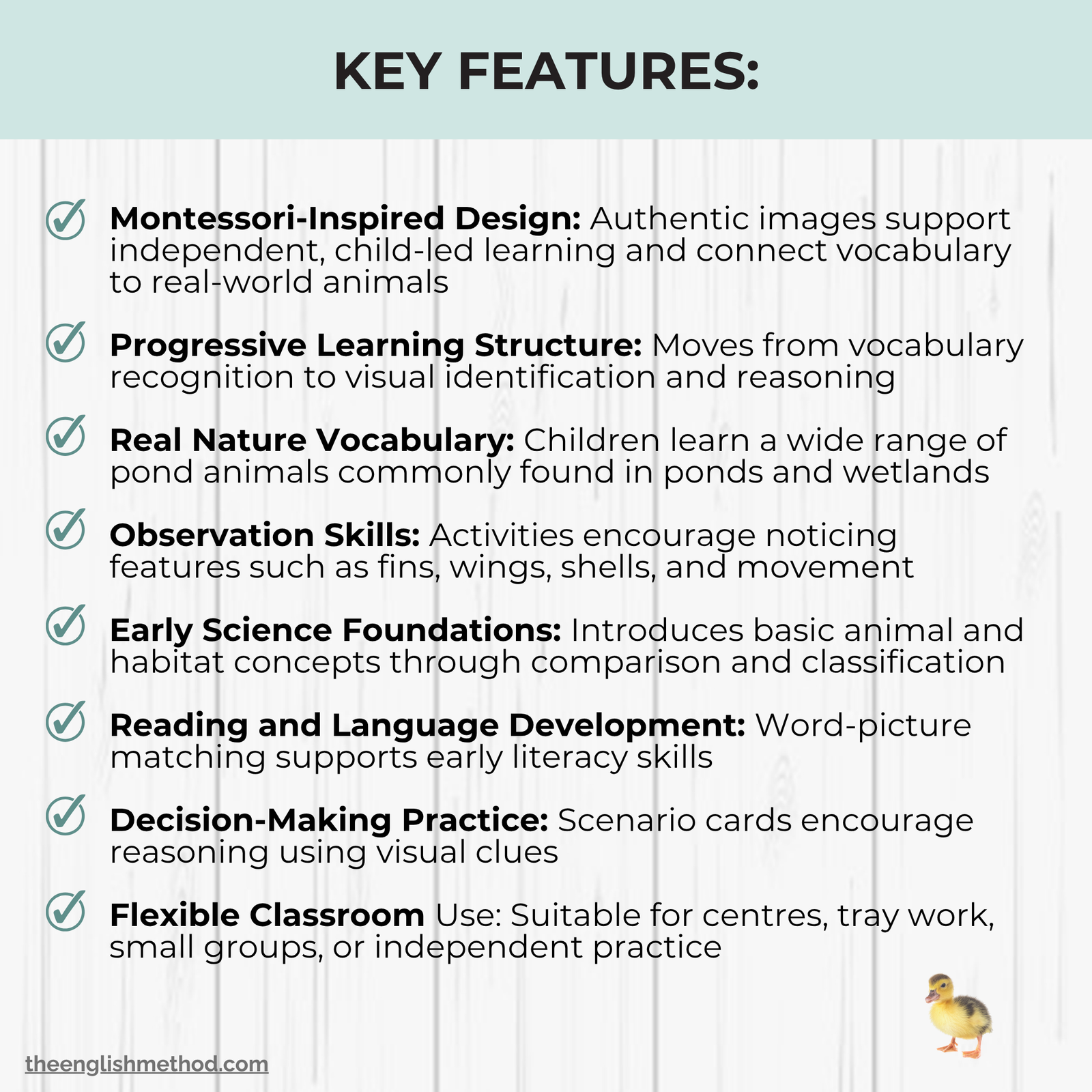 • Real Nature Vocabulary: Children learn animals commonly found in ponds and wetlands