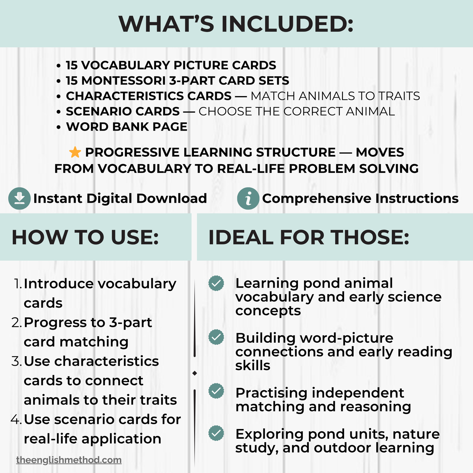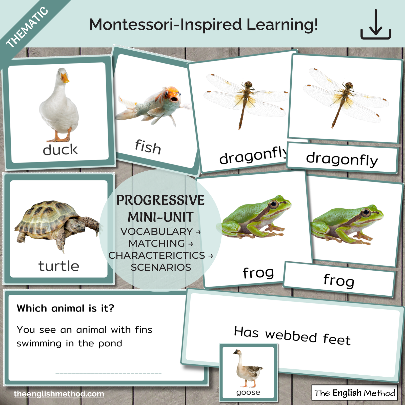 This Montessori-inspired unit includes vocabulary cards, 3-part cards, characteristics cards, and scenario cards designed to support independent learning, language development, and early science thinking. Children build confidence as they identify pond animals, match words to images, and use visual clues to recognise different animals.
