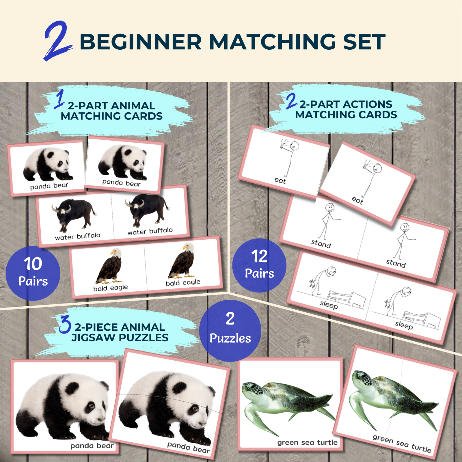 - Beginner Matching Set – 22 pairs of animal and action cards + 2 puzzles