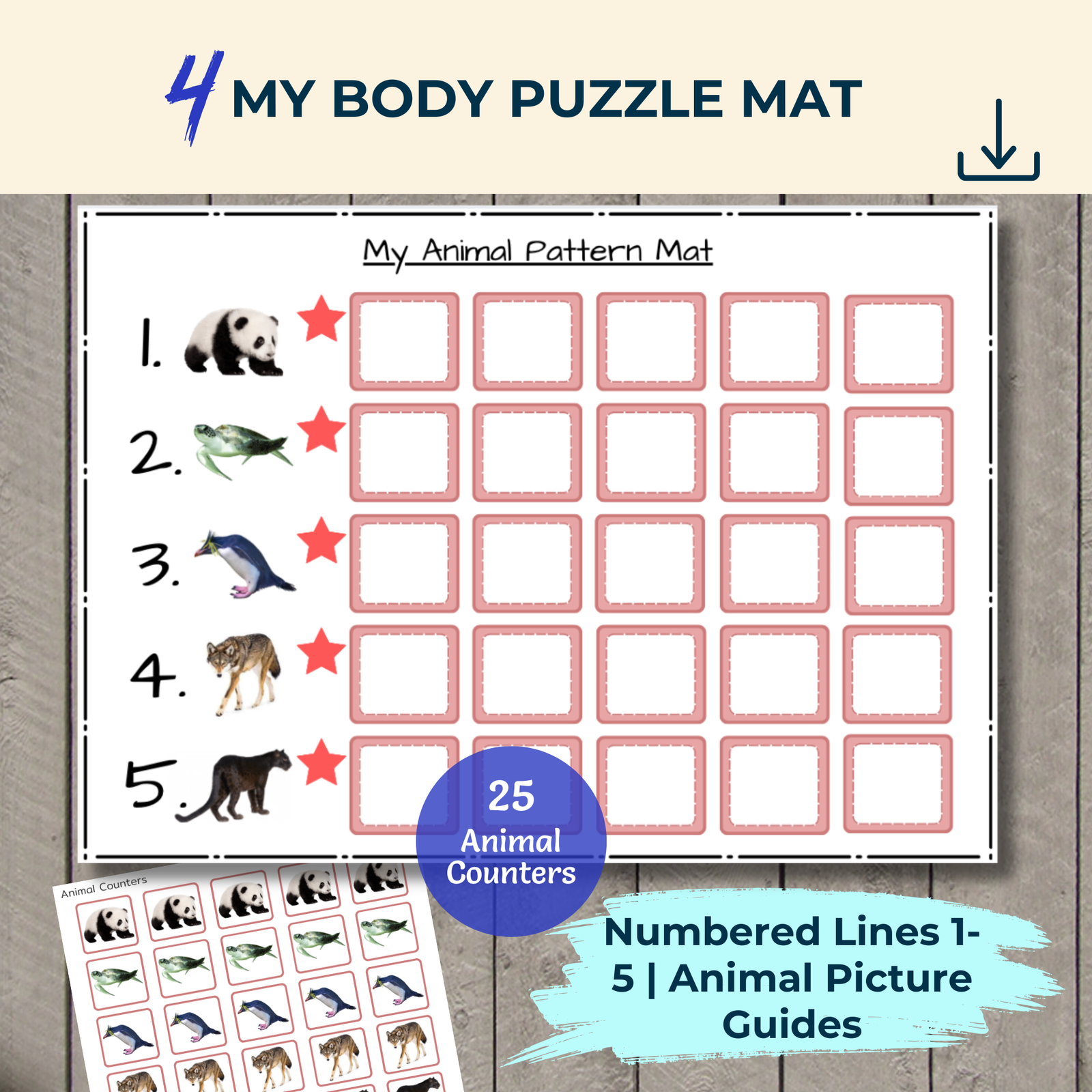 - My Animal Pattern Mat – Sequential pattern building with 25 animal counters