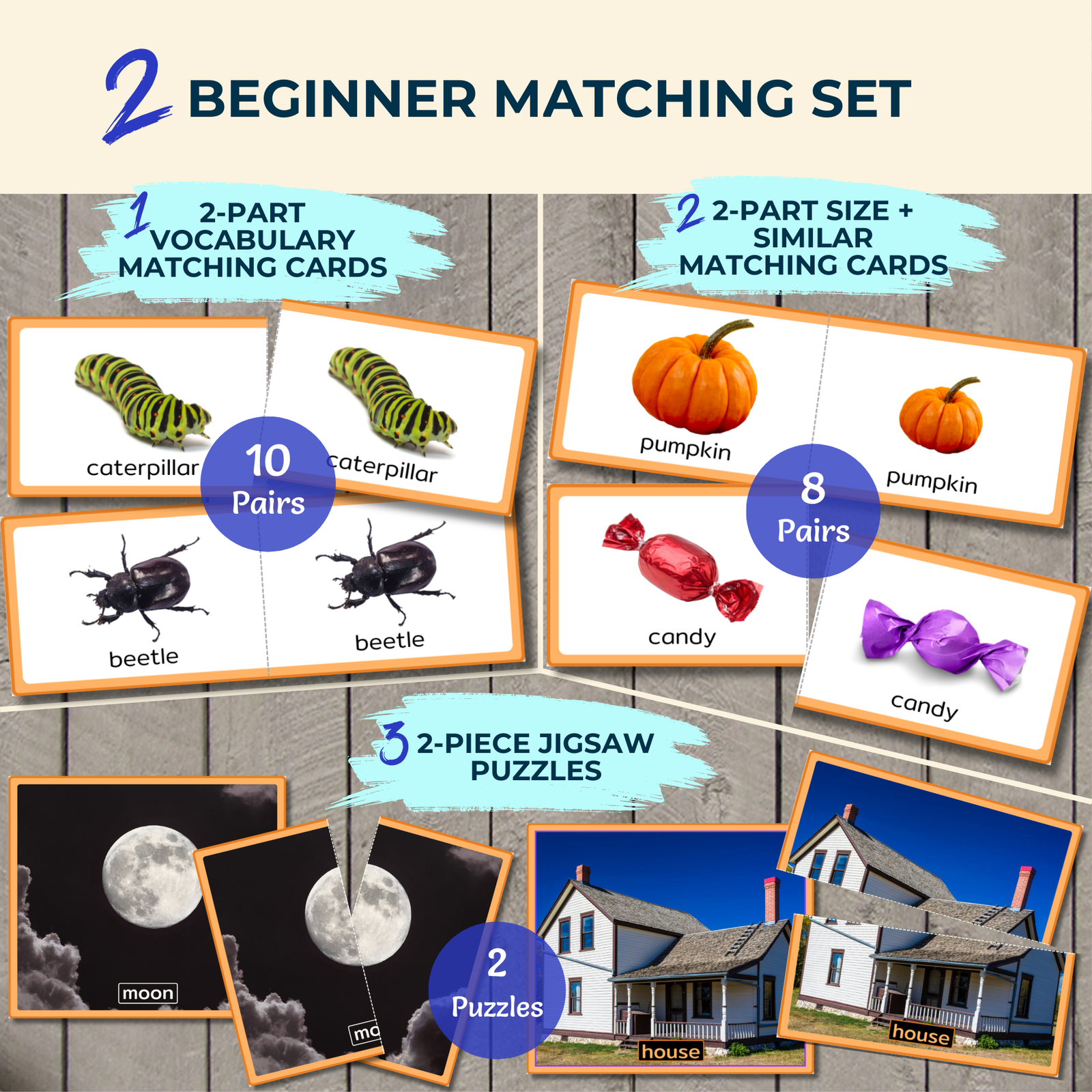 - Beginner Matching Set – 10 x identical pairs, 4 x size variations, 4 x similar pictures, and 2 x puzzles
