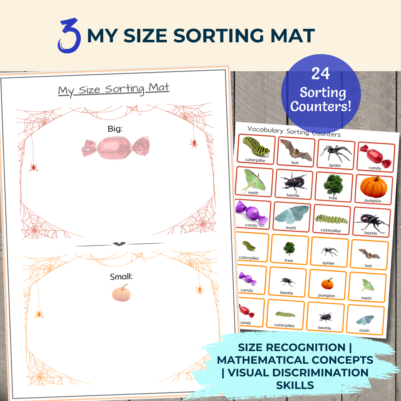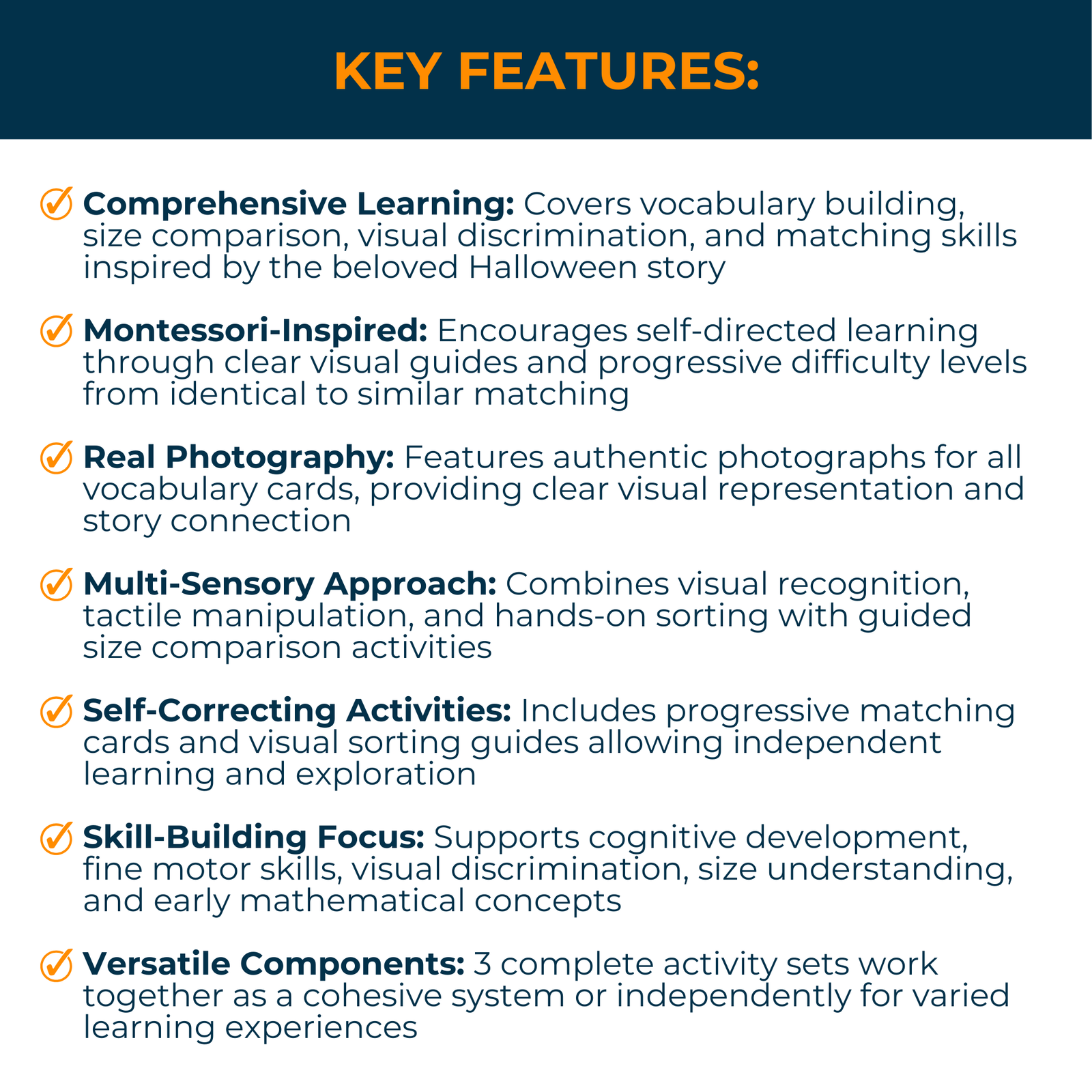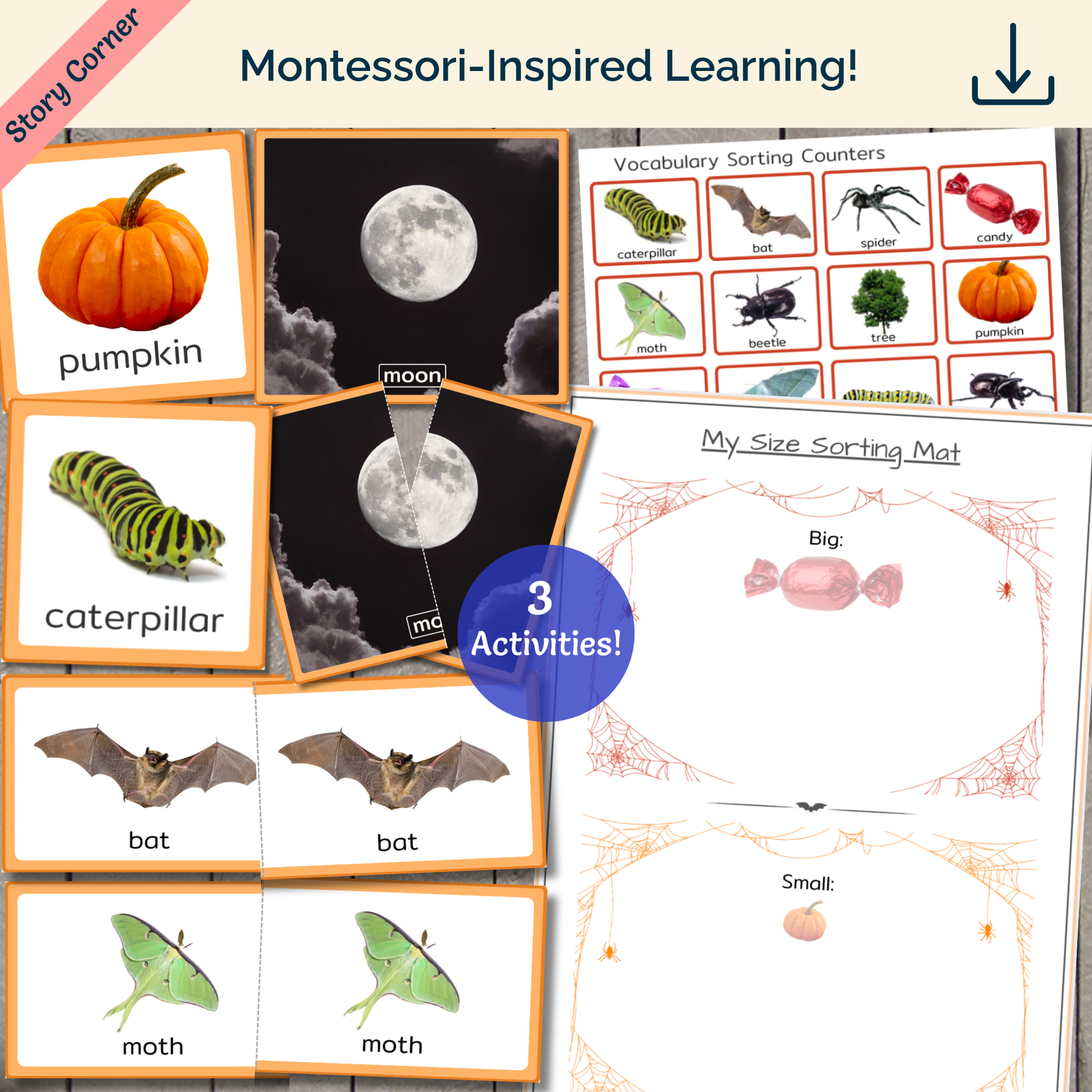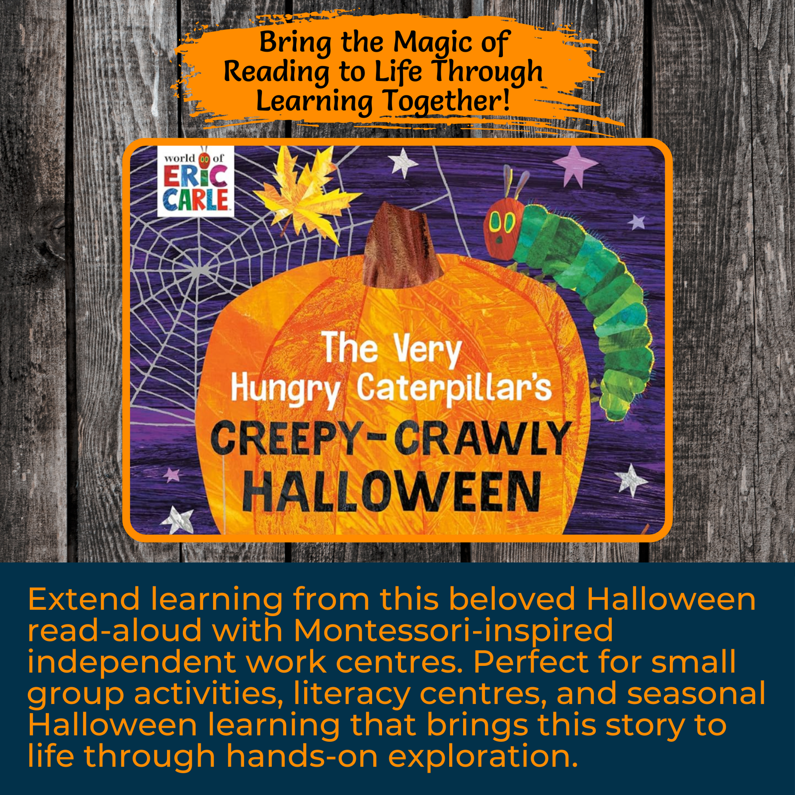 Based on the beloved nursery read-aloud ‘The Very Hungry Caterpillar’s Creepy-Crawly Halloween’ by Eric Carle, this comprehensive resource pack develops essential vocabulary acquisition, visual discrimination, and size comparison skills through research-based, hands-on exploration. This multi-component system supports object recognition, matching abilities, and classification understanding while engaging young learners through progressive, self-directed activities designed specifically for emerging developmental stages.
