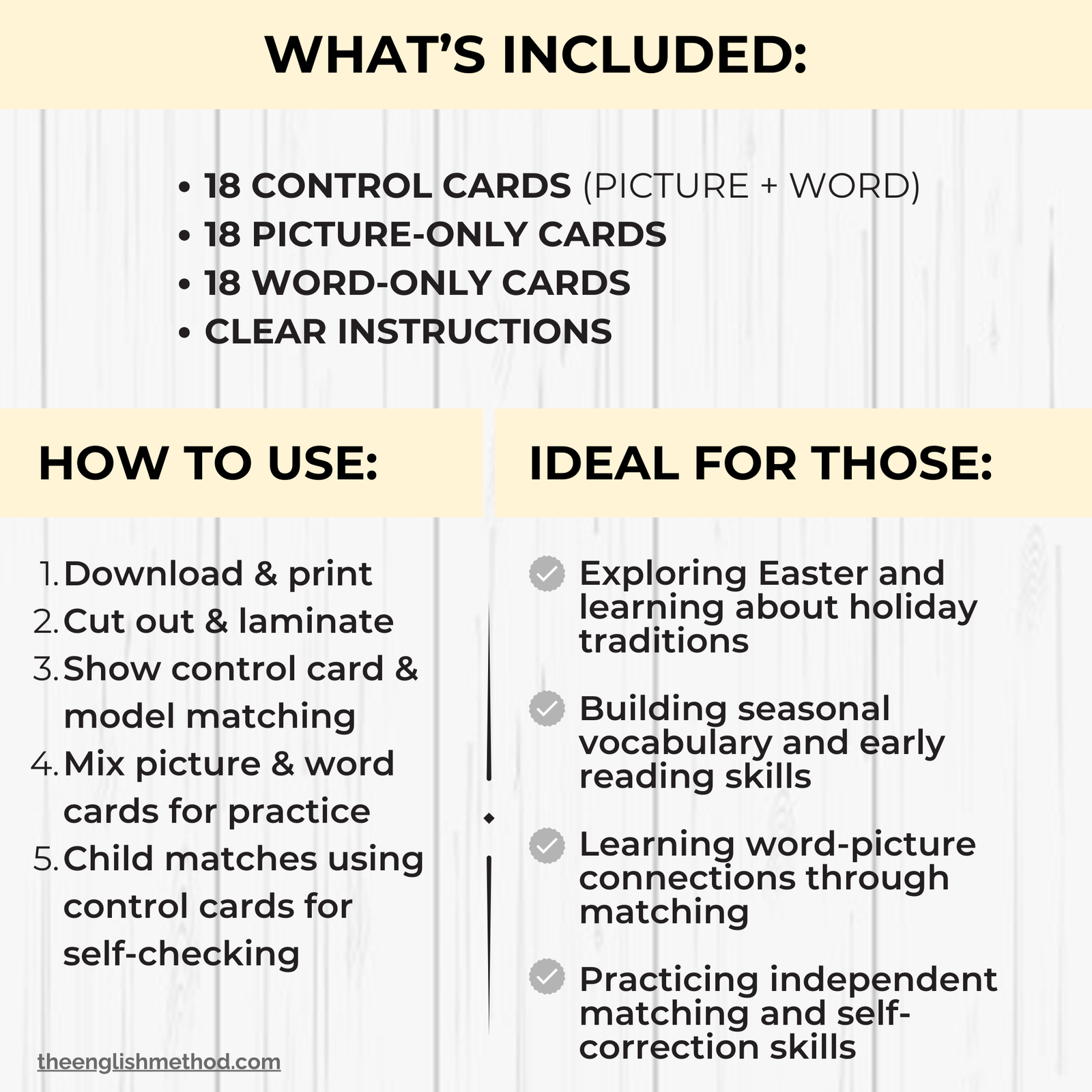 • 18 control cards (picture + word)