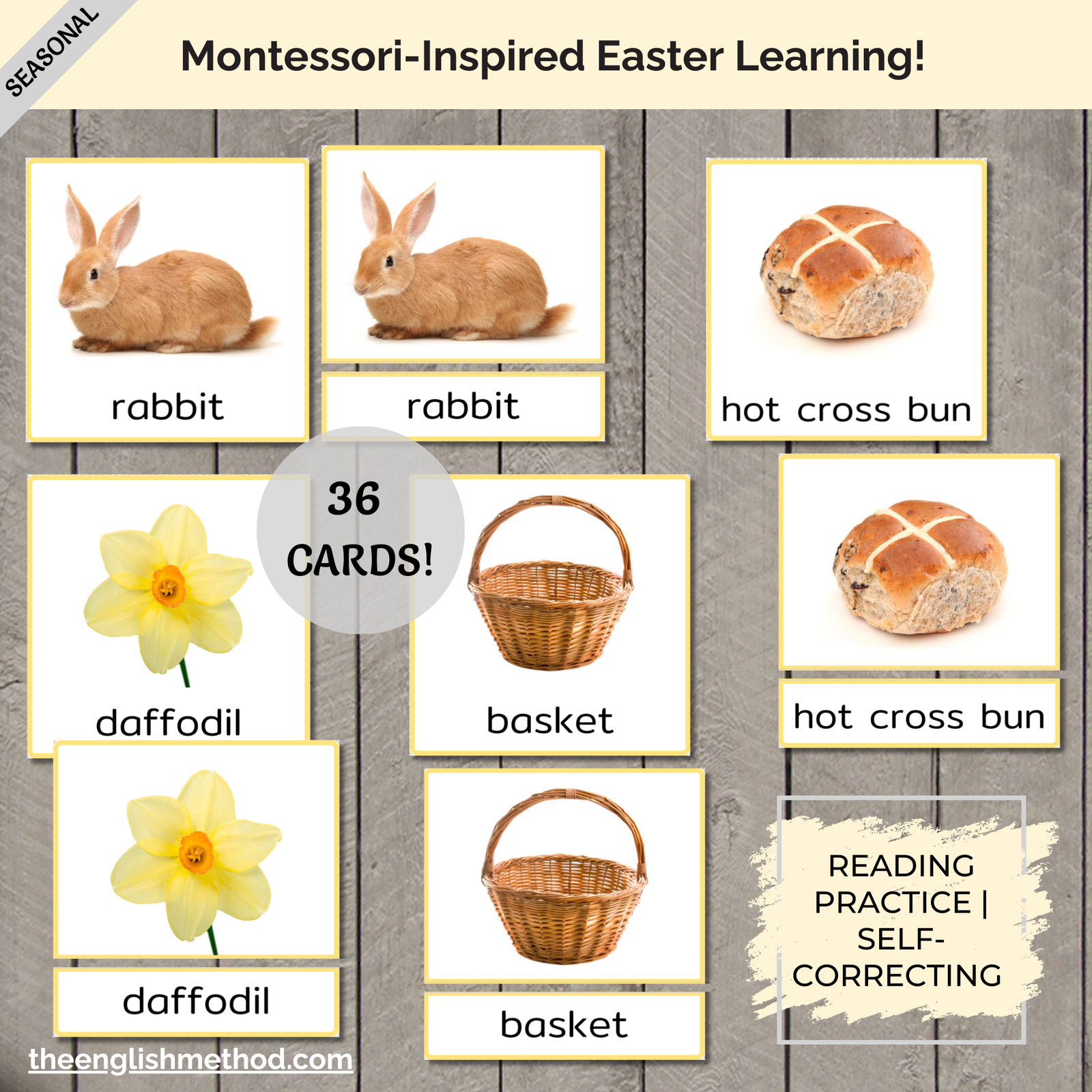 Build Easter vocabulary and early reading skills with these 3-part cards! Children learn 18 Easter words through self-correcting matching activities – from animals like rabbits and chicks to spring flowers like daffodils and tulips to traditional Easter items like baskets and hot cross buns. Each set includes picture cards, word labels, and control cards featuring real photos.