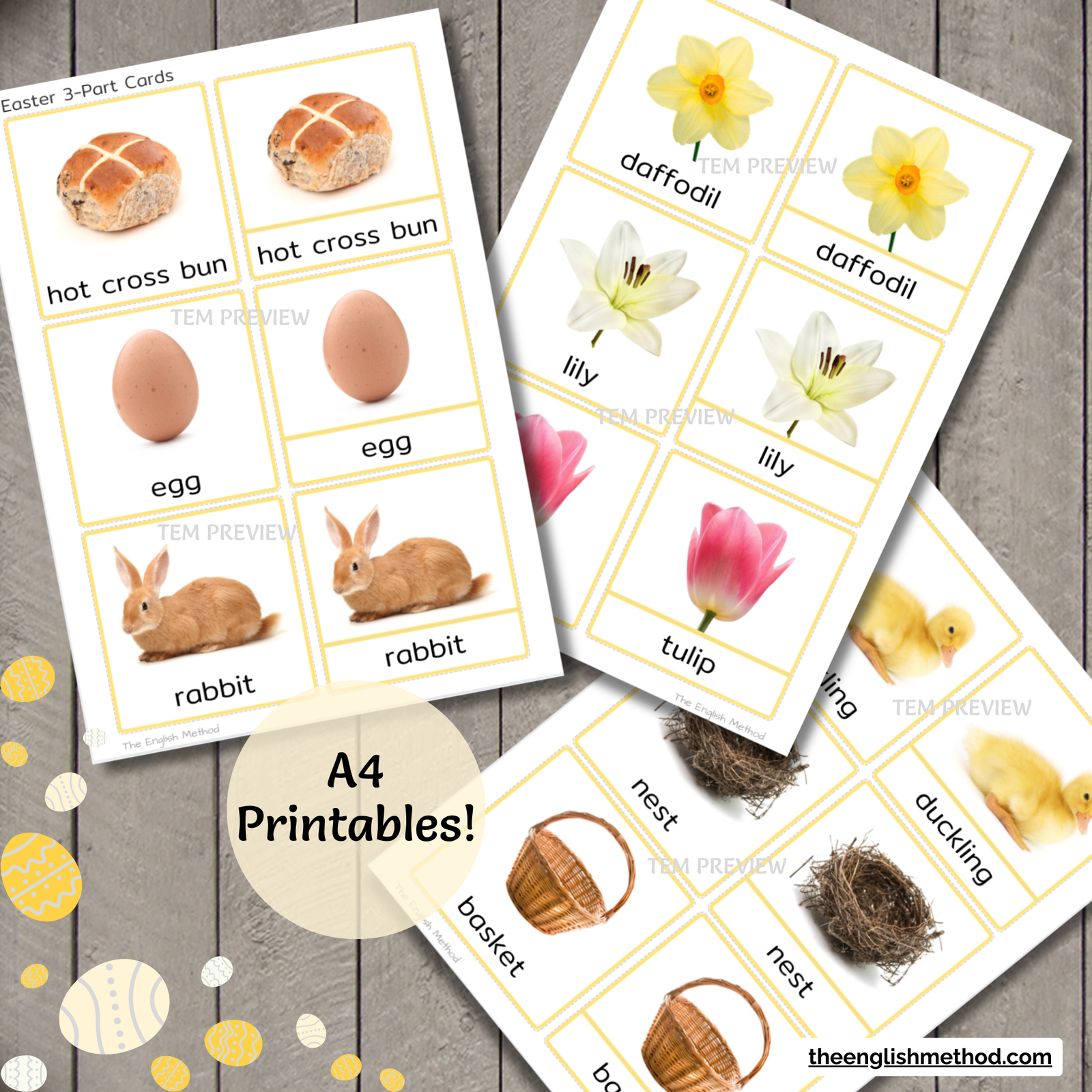 • Easter Vocabulary: Egg, Rabbit, Chick, Basket, Lamb, Duckling, Nest, Carrot, Daffodil, Lily, Tulip, Butterfly, Chocolate, Candy, Hen, Grass, Hot Cross Bun, Bonnet