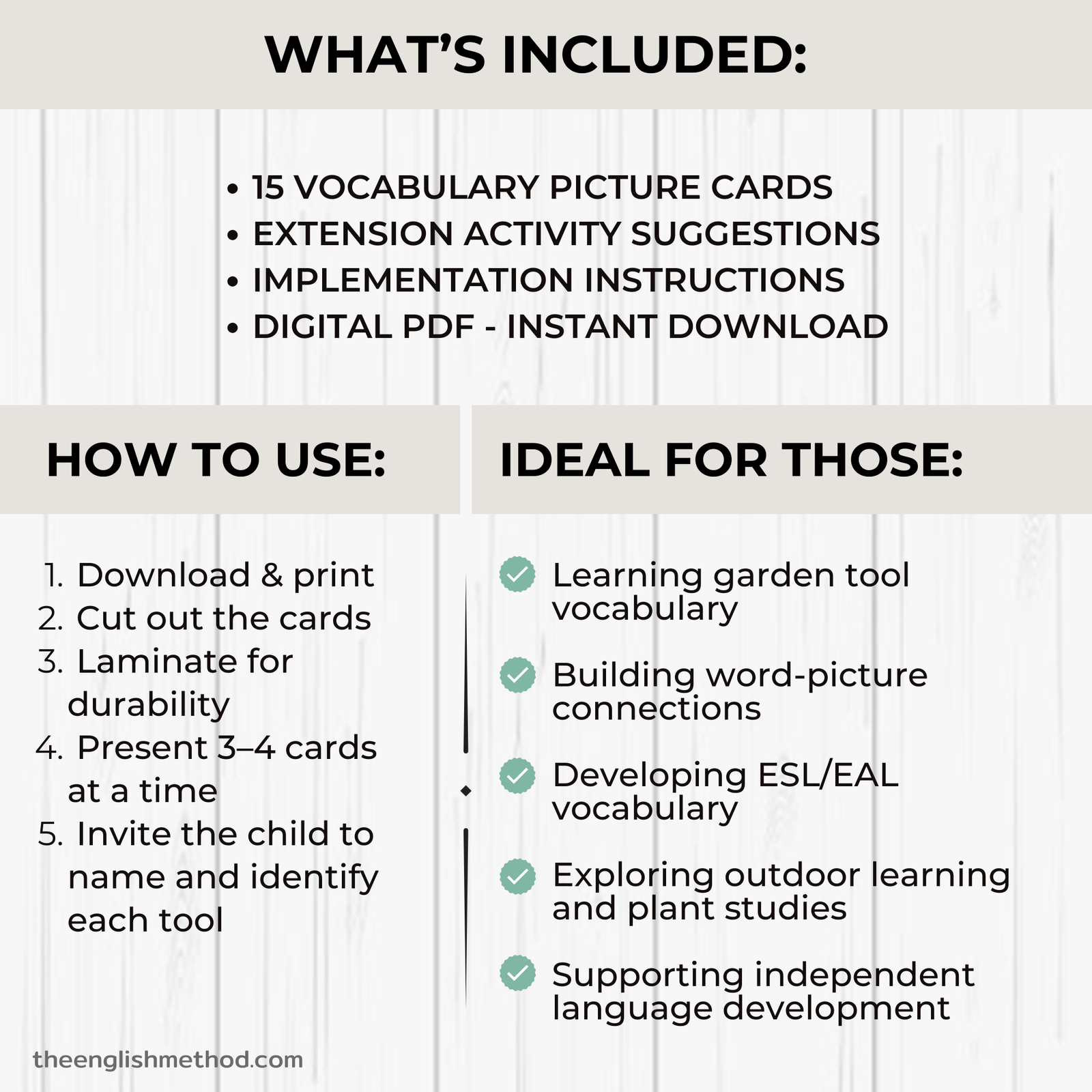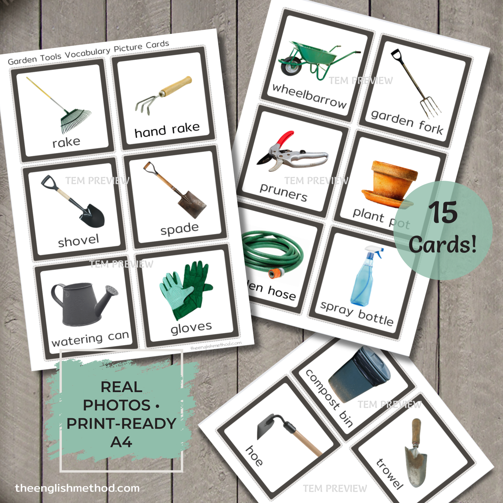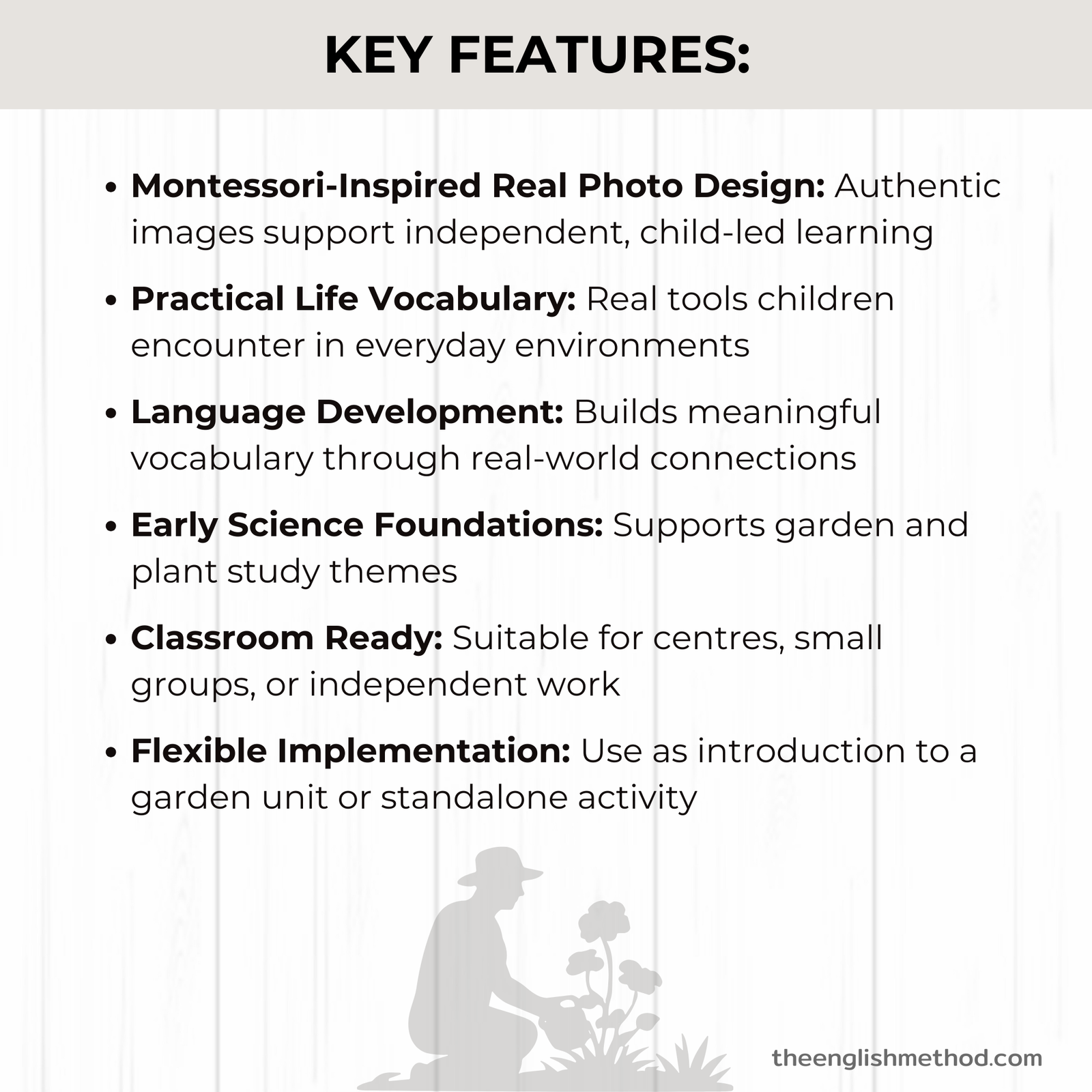 Build real-world garden vocabulary with these Montessori-inspired Garden Tools vocabulary cards. Children learn 15 essential garden tools through clear real-photo images that support language development, object recognition, and early science understanding.