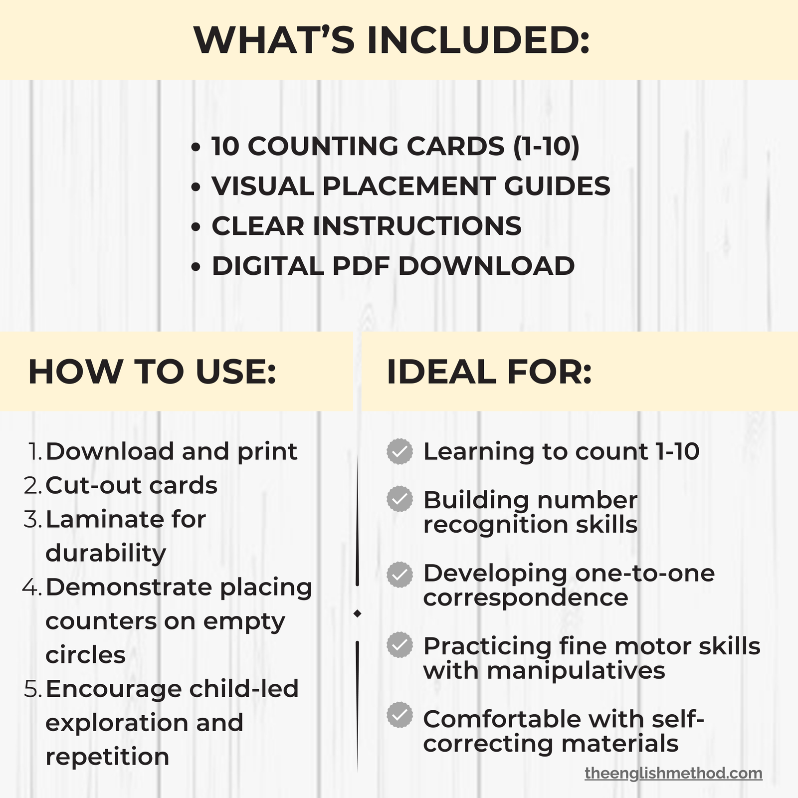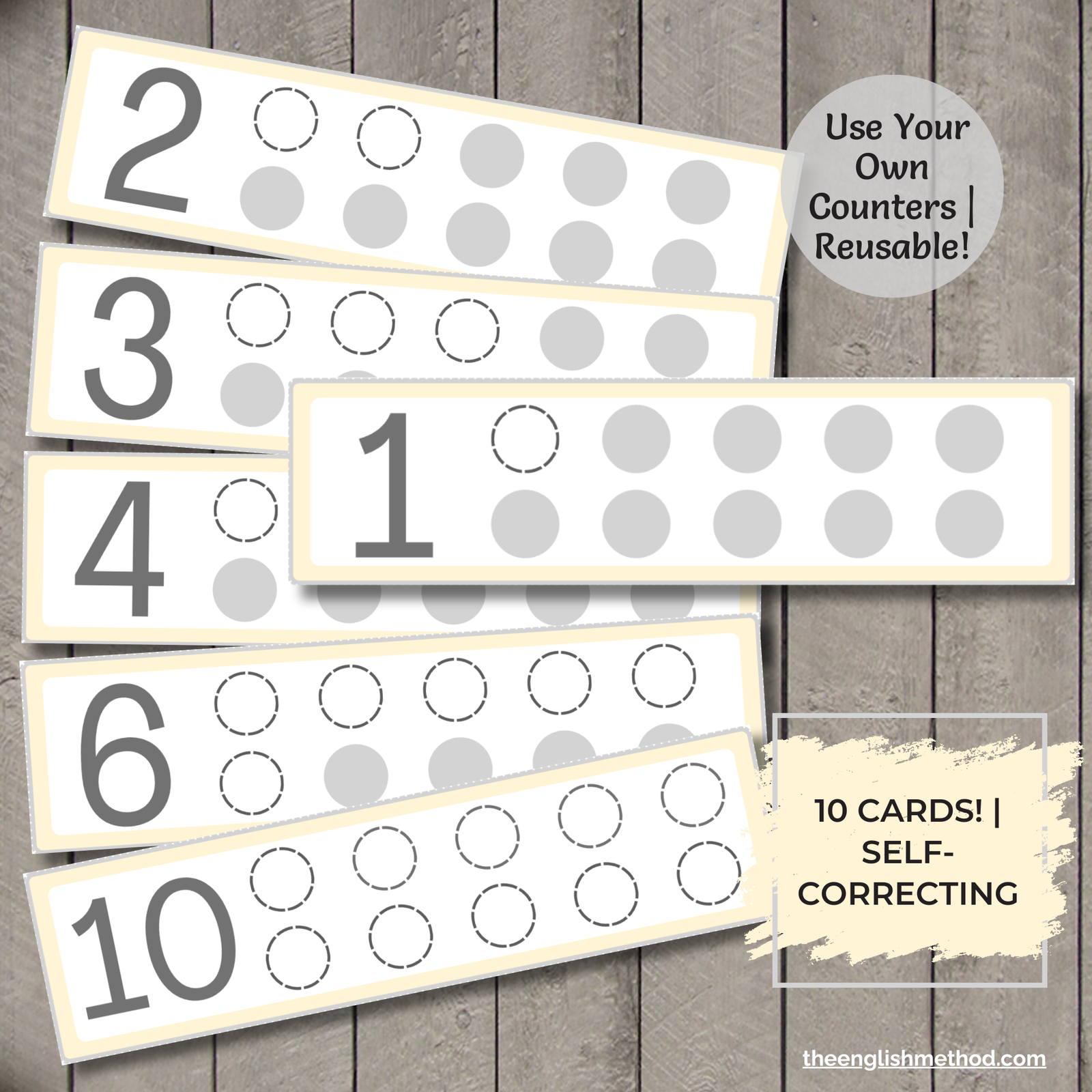 Build number sense with hands-on counting cards! Children practice counting 1-10 by placing counters on visual guides. Self-correcting design with greyed circles shows exactly when to stop counting. Works with any small counters – buttons, pom-poms, seasonal items.