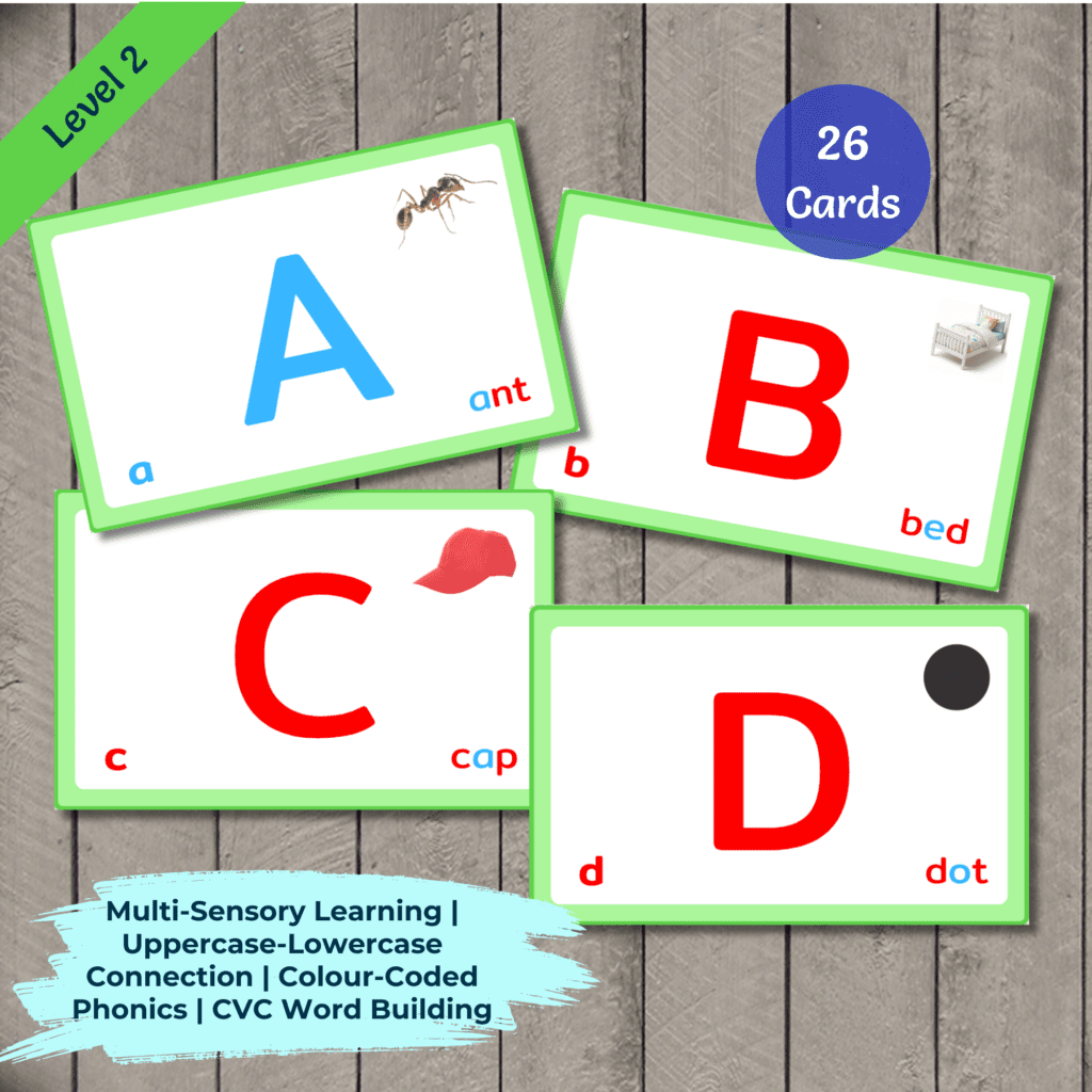Your Alphabet Sound Action Cards (Level 1: lowercase, picture, sound, action) and Alphabet Cards (Level 2: uppercase letter, lowercase letter, picture, CVC word, colour-coded letters) exemplify this multi-sensory approach by offering children multiple ways to engage with letter learning. The integration of visual elements (uppercase and lowercase letters, pictures), auditory components (letter sounds), and kinaesthetic activities (sound actions) creates a comprehensive learning system that accommodates diverse learning preferences and maximises learning outcomes.